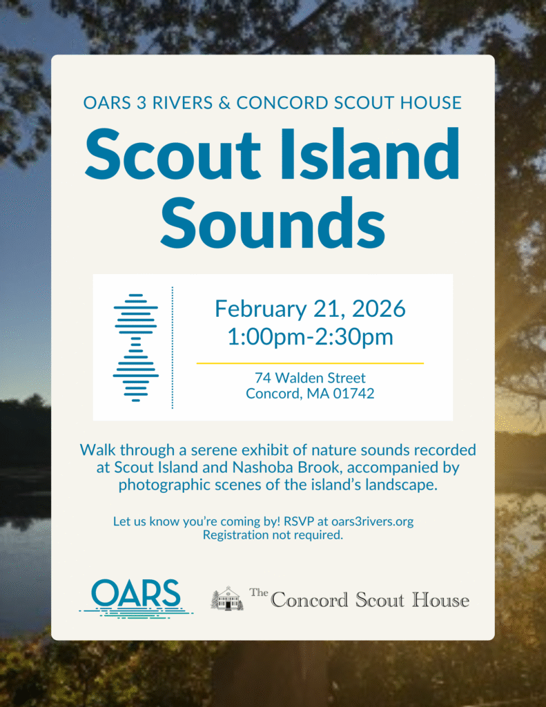 Join OARS at the Concord Scout House for an afternoon pop-up exhibit of nature sounds recorded at Scout Island and Nashoba Brook. Enjoy the sounds of water, birds, and wildlife as you walk through the hall, accompanied by photographs and projections of the island.