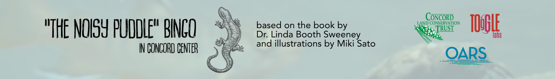 Join in on this 3-day, cross-town bingo game and learn more about fascinating vernal pool species. Pick up a game board at local sites and hunt for image icons of critters from The Noisy Puddle, written by Linda Booth Sweeney and illustrated by Miki Sato, around Concord Center. Local businesses will have these icons inside or in their windows, where you can check off a new animal on your bingo card. Return your completed card to be entered in a drawing for signed copies of Linda’s books and a private, guided, family-friendly walk to learn more about a vernal pool up close with the Concord Land Conservation Trust.